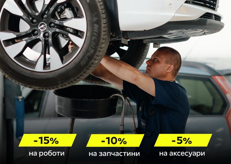Пропозиція діє з 01.01.2026 по 31.12.2026 в дилерському центрі Опель ВІДІ Адванс для фізичних осіб, які придбали автомобіль не в дилерському центрі Опель ВІДІ Адванс і вперше завітали на сервісне обслуговування або не обслуговували свій автомобіль на сервісі дилерського центра понад 14 місяців. Пропозиція не сумується з іншими акціями чи пропозиціями. Знижки нараховуються у разі достатньої націнки на товари та послуги.