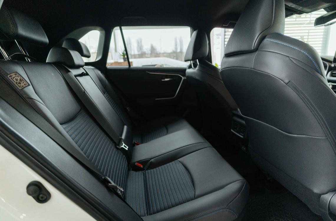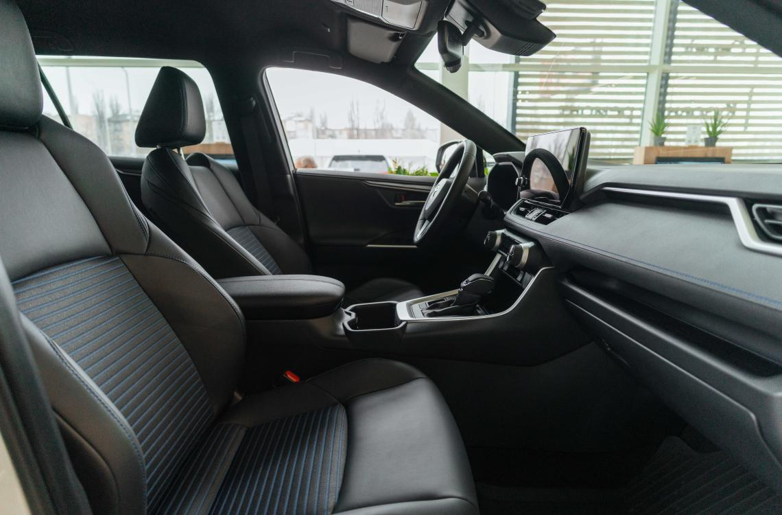Комбинированная отделка сидений синтетической кожей и тканью с синими акцентами
